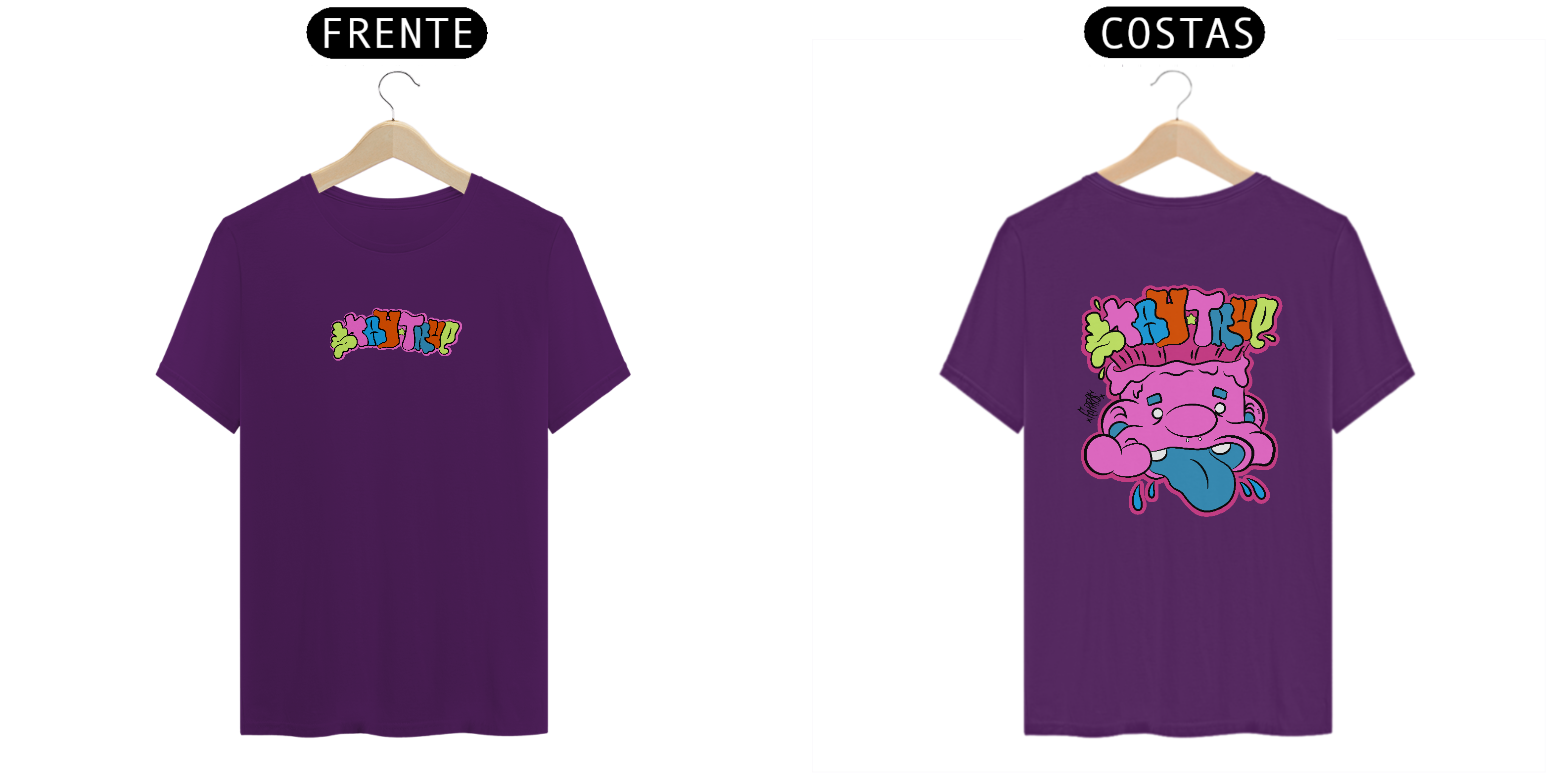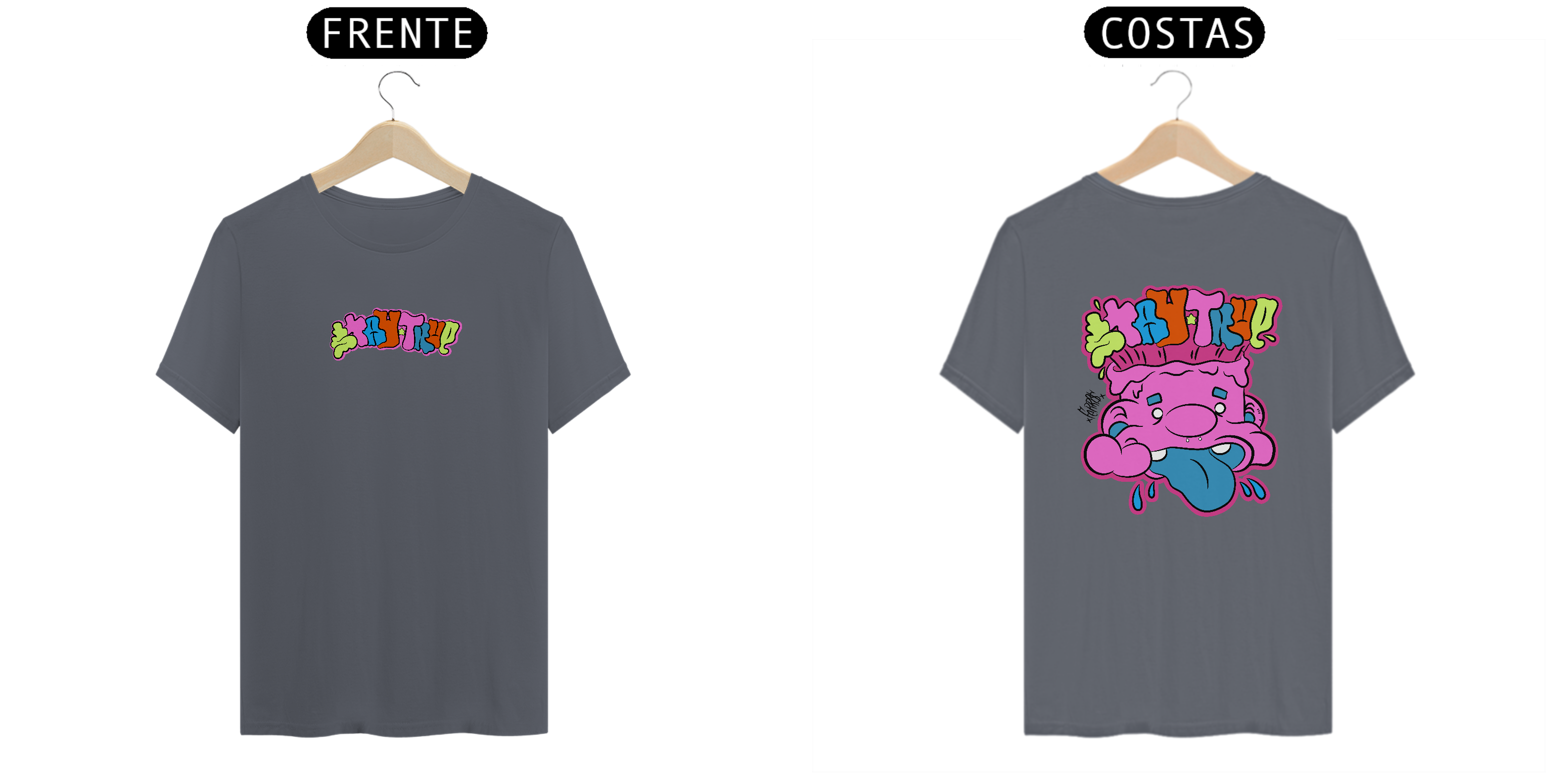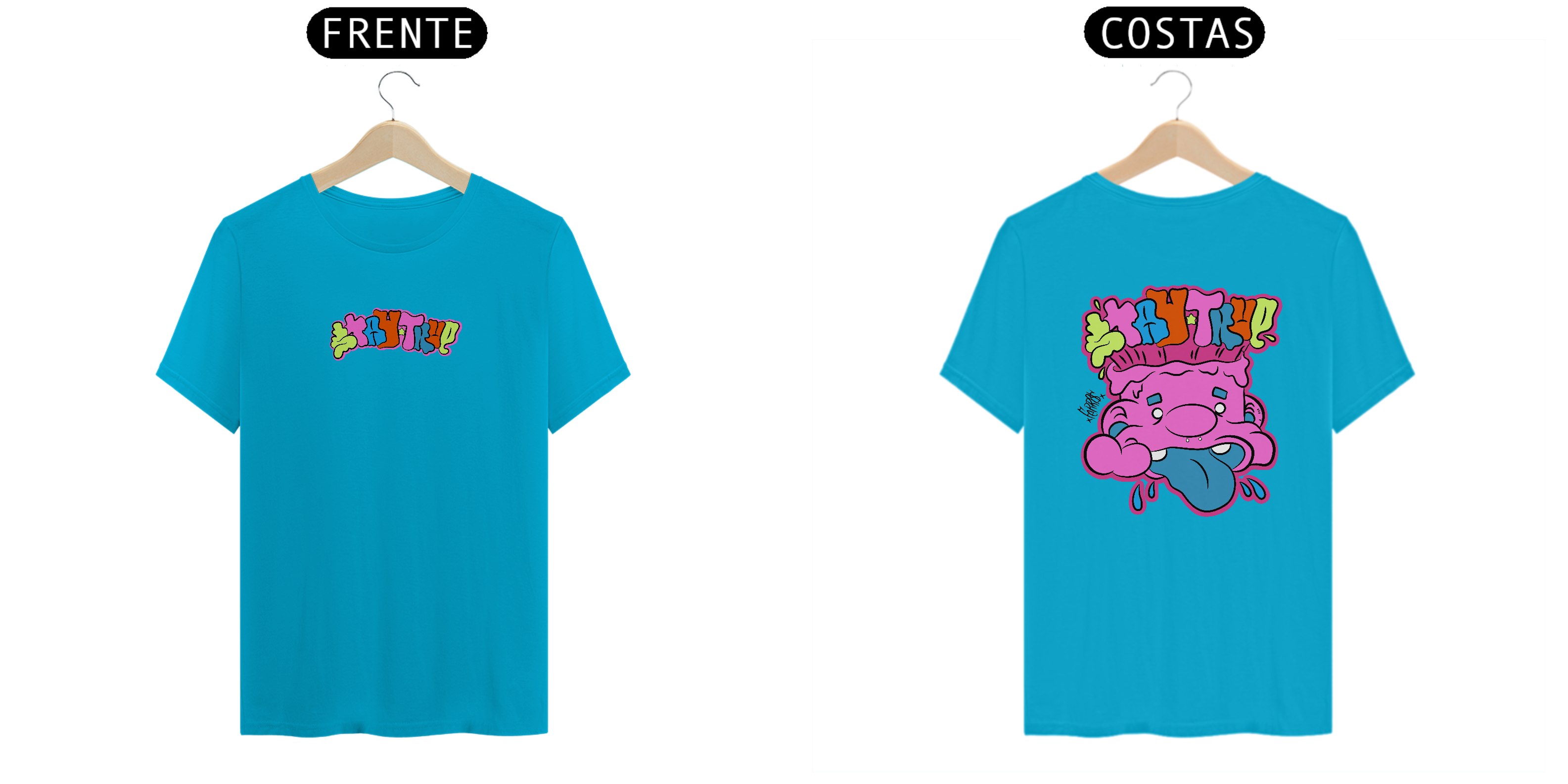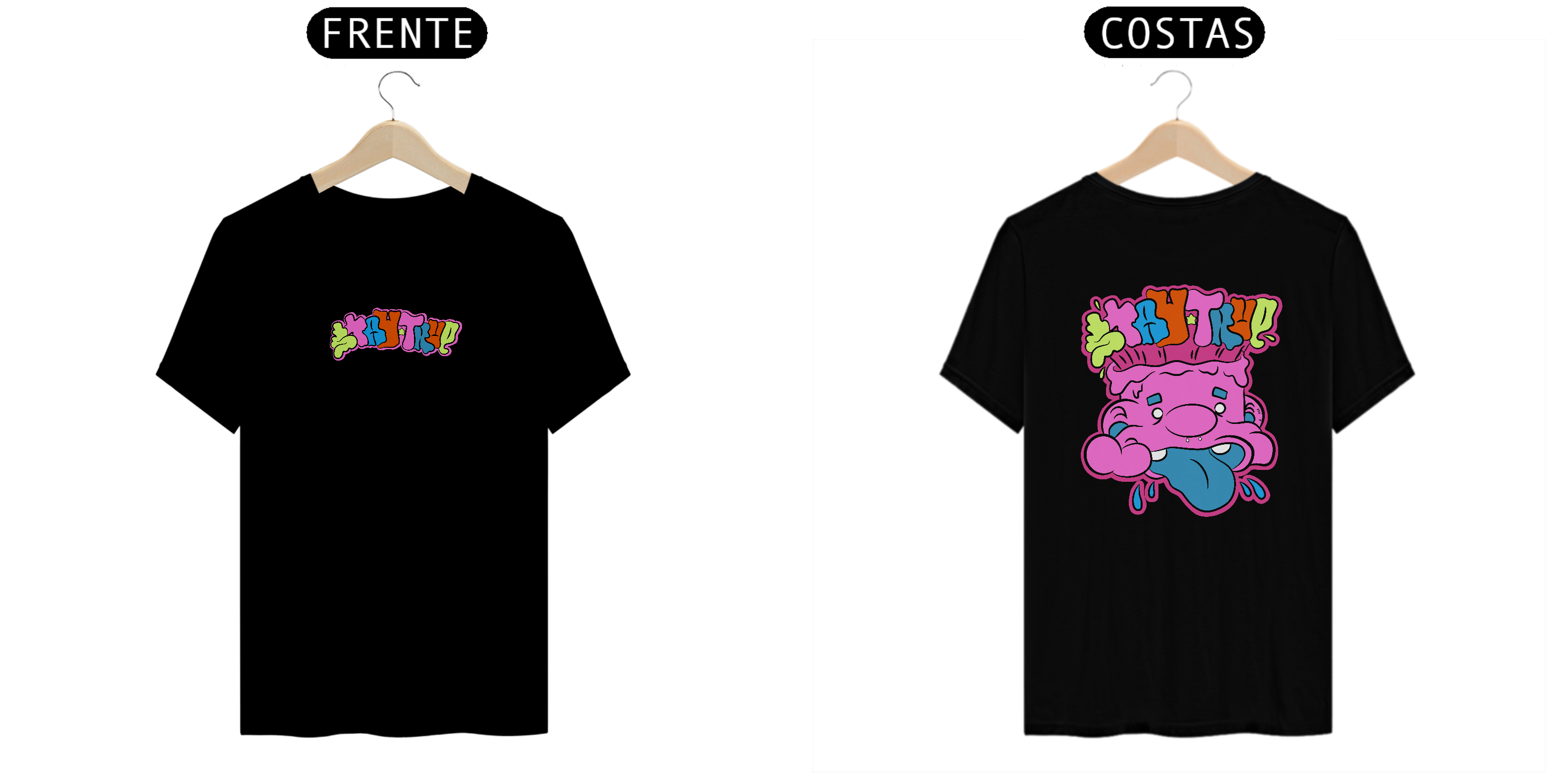 Nas costas, a narrativa completa: uma cabeça derretendo, língua pra fora, olhos perdidos — um retrato visceral de uma mente sobrecarregada, criativa e prestes a explodir. Os elementos escorrem, vibram e se distorcem como pensamentos em curto-circuito.