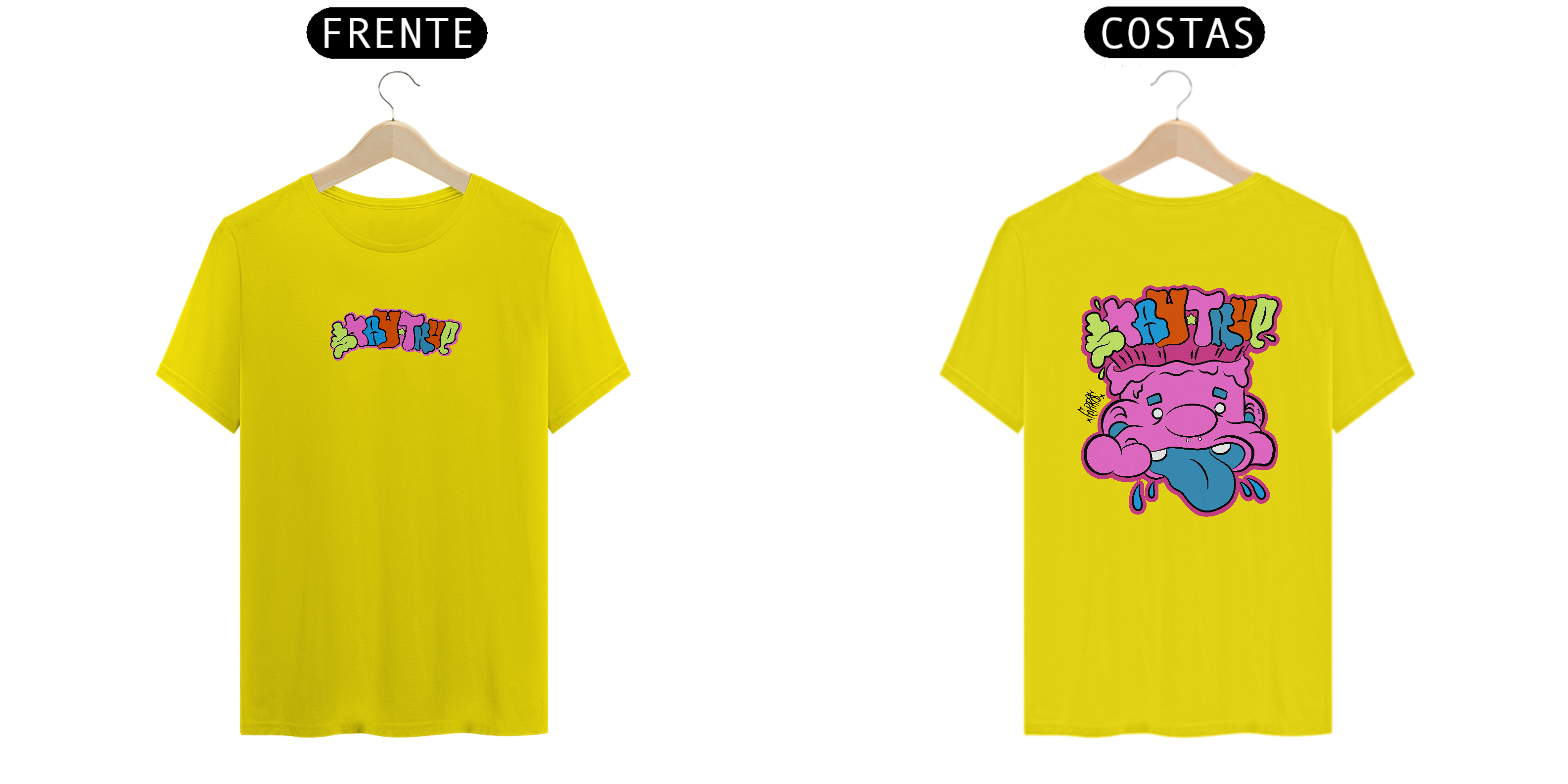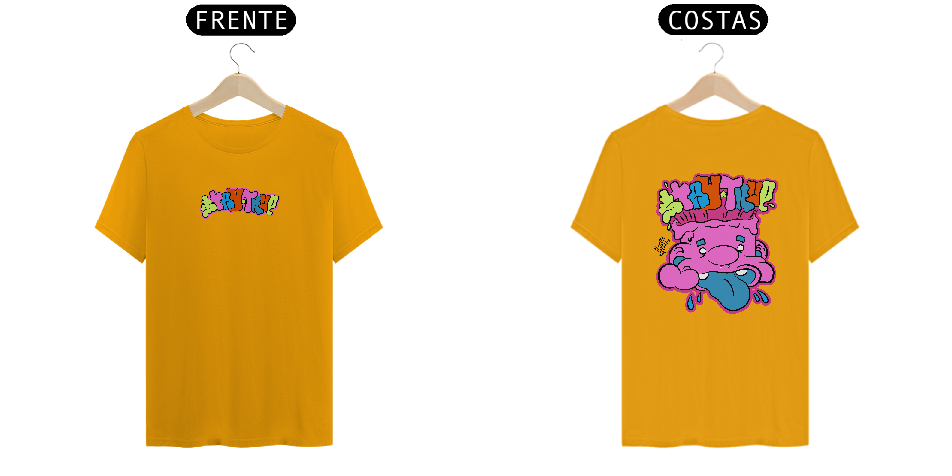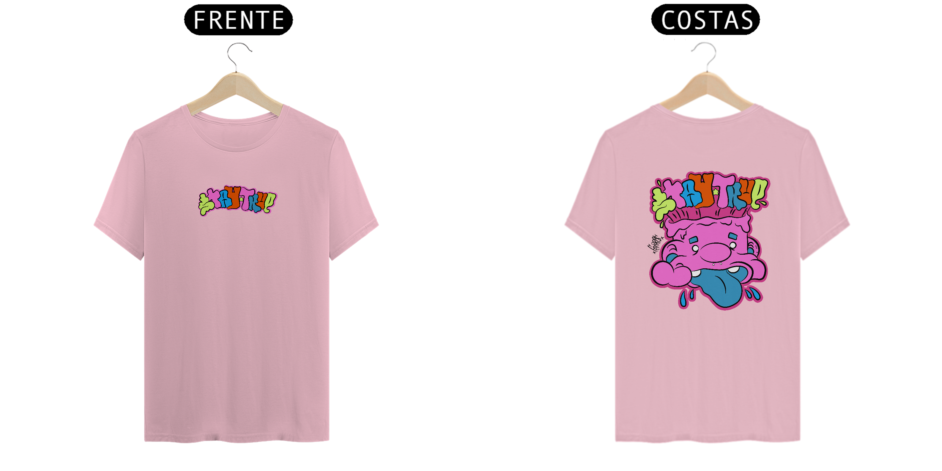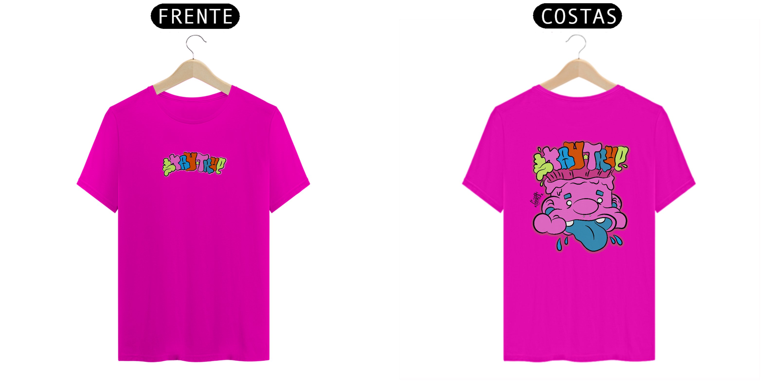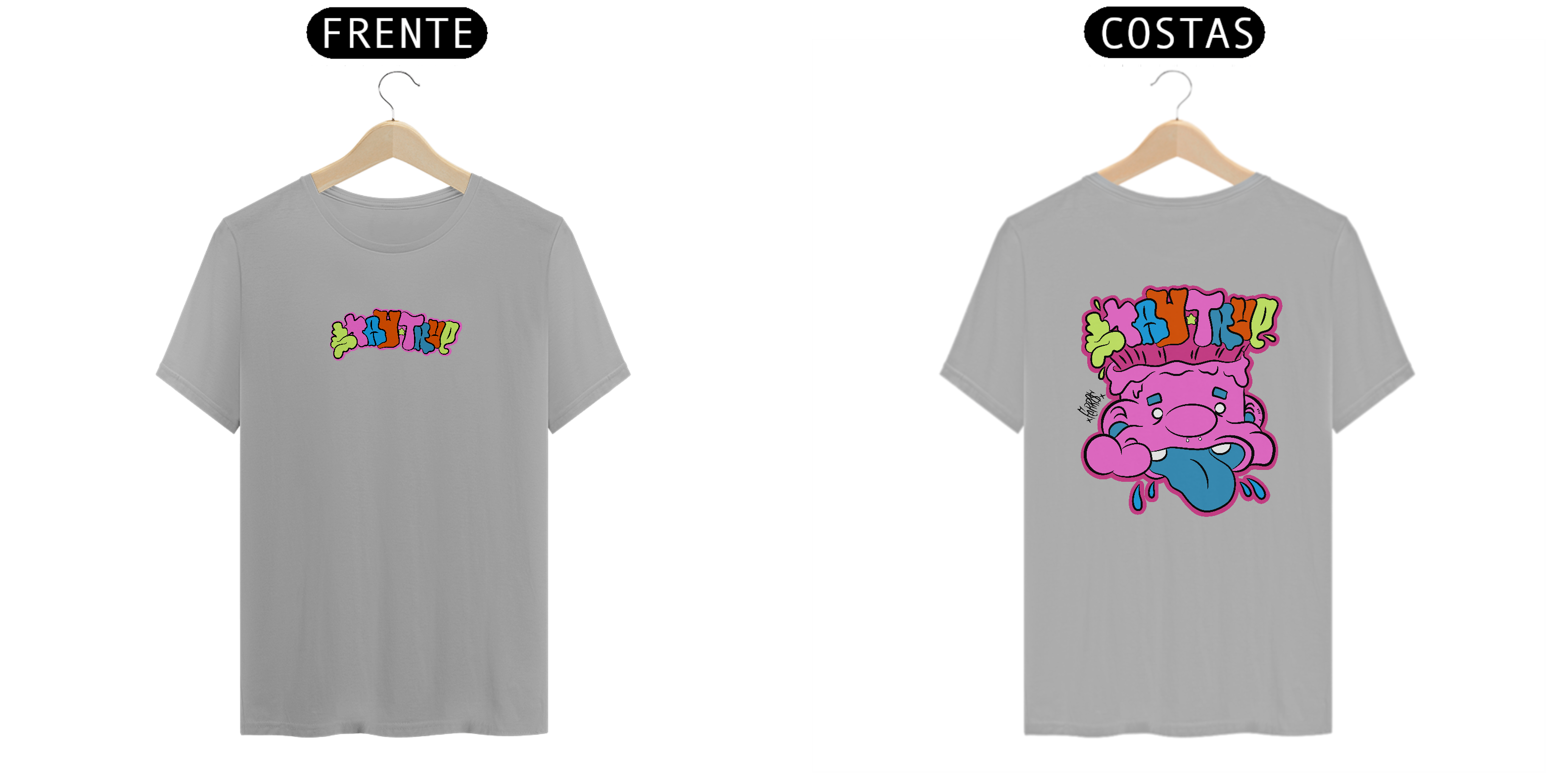 Nas costas, a narrativa completa: uma cabeça derretendo, língua pra fora, olhos perdidos — um retrato visceral de uma mente sobrecarregada, criativa e prestes a explodir. Os elementos escorrem, vibram e se distorcem como pensamentos em curto-circuito.